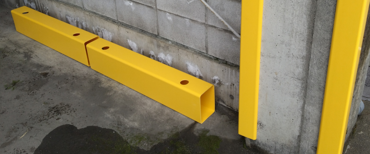 物流施設や倉庫、工場などで、かご台車やフォークリフトから、柱の角を保護する目的で開発した、